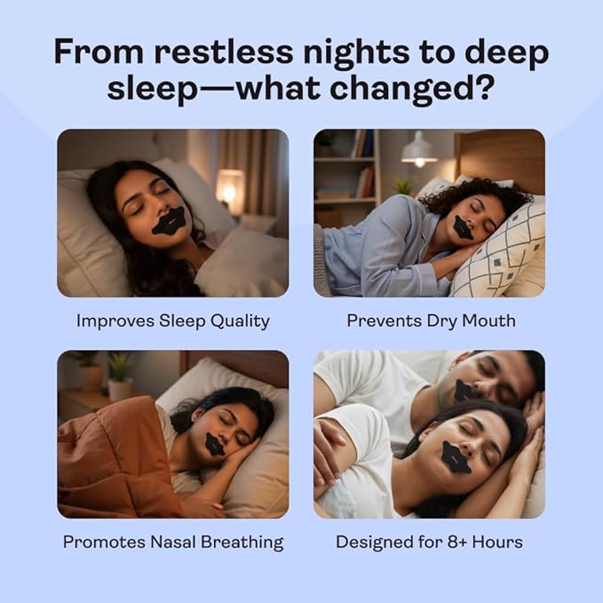 Mouth tape encourages nasal breathing while you sleep, which can help reduce snoring and improve sleep quality. By keeping your mouth closed, it prevents dry mouth and bad breath, while promoting better oxygen flow for a more restful night. If you’re struggling with poor sleep, mouth tape is a simple yet effective solution.