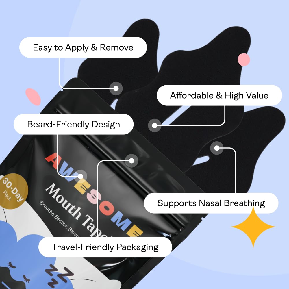 Sleeping with Awesome Mouth TapeTM is a simple shift that leads to better breathing, quieter nights, and more energized mornings. Just deeper sleep — naturally.