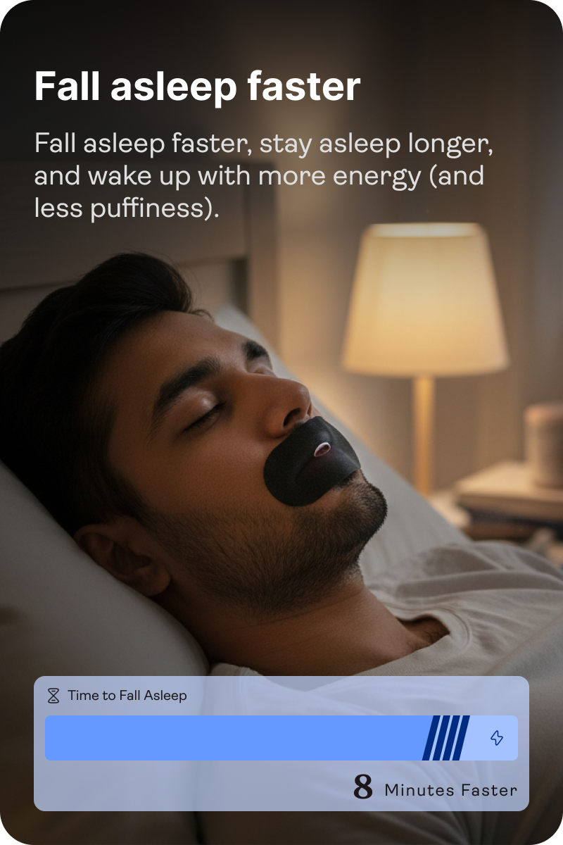 Awesome Mouth Tape™ gently trains you to breathe through your nose, helping you sleep deeper, reduce puffiness, and wake up truly refreshed — no pills, no machines, just better sleep through better breathing.