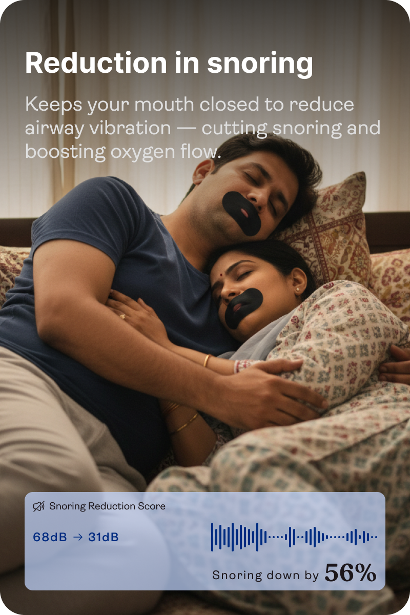 Mouth tape keeps your mouth closed, ensuring that you breathe through your nose rather than your mouth. Since mouth breathing can contribute to snoring, nasal breathing reduces throat vibrations, which means less snoring. Our mouth tape is perfect for anyone looking to reduce nighttime disturbances and sleep more soundly.