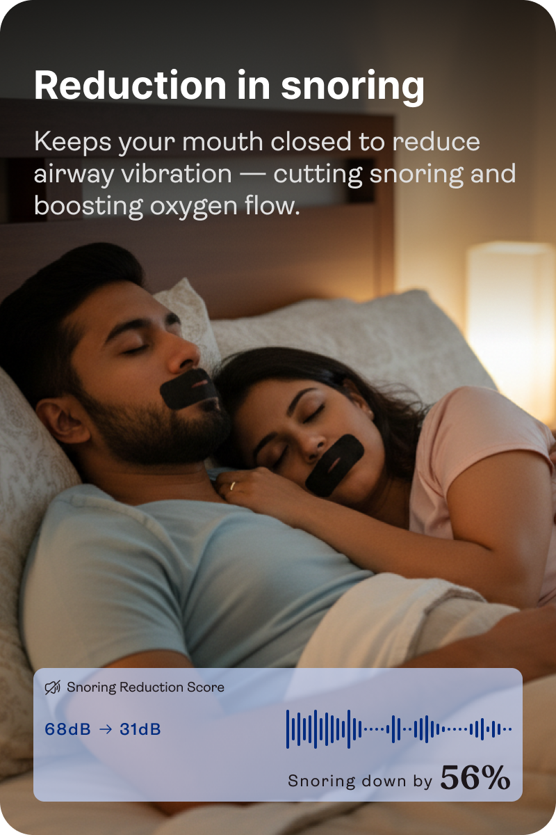 Mouth tape keeps your mouth closed, ensuring that you breathe through your nose rather than your mouth. Since mouth breathing can contribute to snoring, nasal breathing reduces throat vibrations, which means less snoring. Our mouth tape is perfect for anyone looking to reduce nighttime disturbances and sleep more soundly.