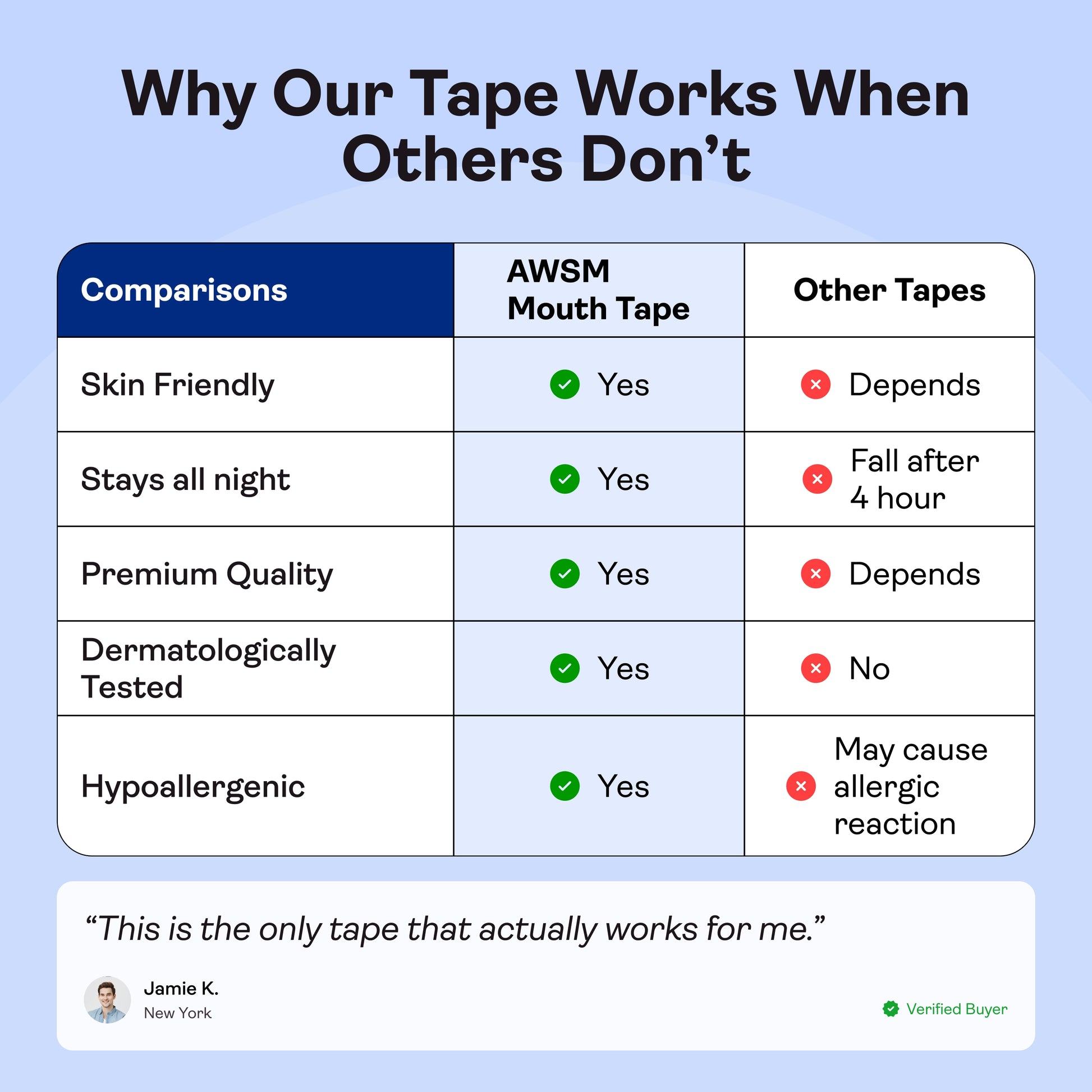 Sleeping with Awesome Mouth TapeTM leads to better breathing, quieter nights, and more energized mornings. Just deeper sleep — naturally.